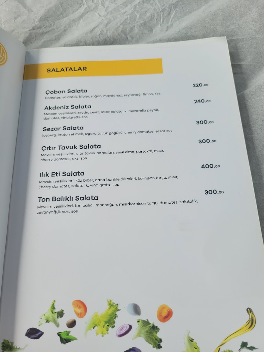 Mevsim yeşillikleri,ton balıgı,mor soğan,mısır,kornişon turşu,domates,salatalık,zeytin yağ,limon sos ile servis edilir.